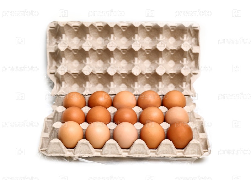 Свежие куриные яйца в бумажном лотке, изолированные на белом фоне