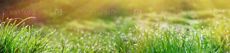 Ярко-зеленая трава с капельками росы под лучами утреннего солнца. Весеннее время
