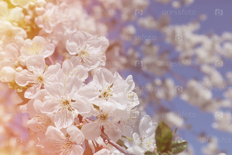 Цветущая ветка вишни на фоне голубого неба. Весеннее время