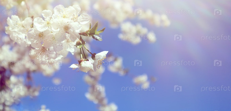 Цветущая ветка вишни на фоне голубого неба. Весеннее время