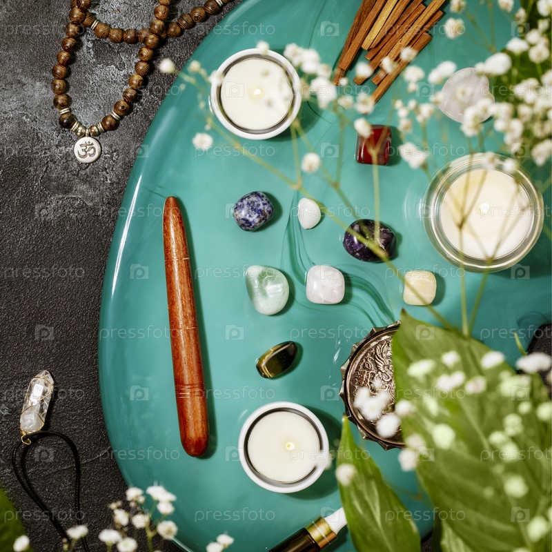 Уход за собой, целебная композиция с четками, ароматическими палочками, камнями чакры, палочками сандалового дерева и свечой на зеленом мраморном подиуме. Концепция расслабления, энергетического исцеления, медитации и времени для себя. Плоская планировка