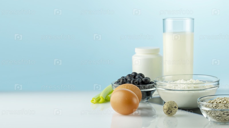 Еда с кальцием для здоровья костей и суставов. Продукты, богатые кальцием, добавки и рентгеновская пленка на белом столе. Здоровое питание. Еда для здоровья костей, источник кальция. Вид спереди, пространство для копирования