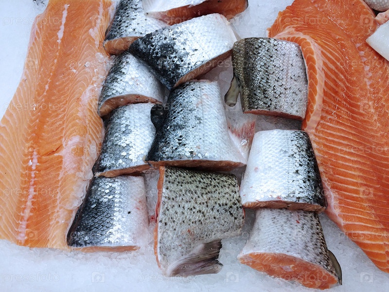 Лосось во льду на прилавке в супермаркете