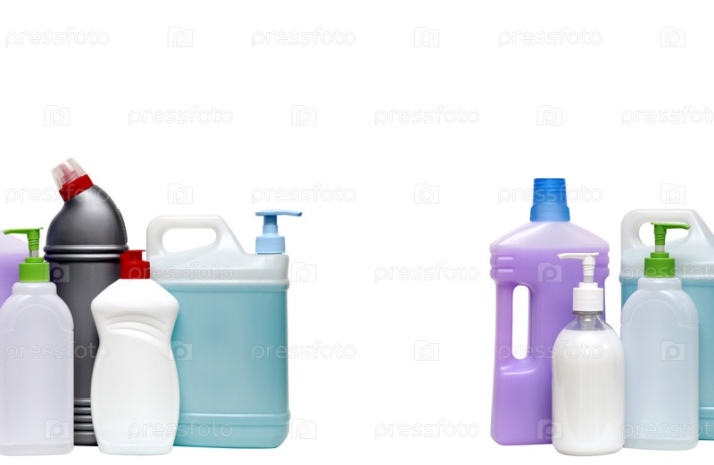Бытовая химия для уборки дома. Моющие средства в пластиковых контейнерах и бутылках, изолированные на белом фоне