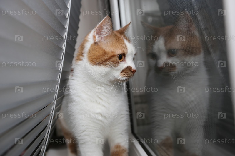 Кот на окне прячется в жалюзи. Кот в заключение смотрит на свою собственную жизнь