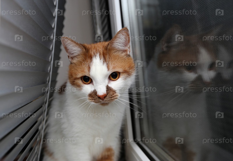 Кот на окне прячется в жалюзи. Кот в заключение смотрит на свою собственную жизнь