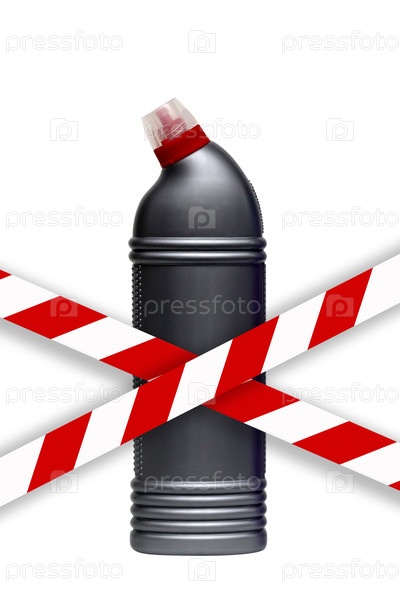 Пластиковые контейнеры и бутылки изолированы на белом фоне с сигнальной лентой на переднем плане. Концепция отказа от одноразового пластика