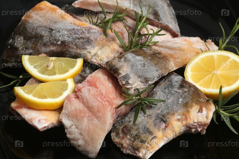 Кусочки замороженной рыбы на блюде с лимоном и розмарином