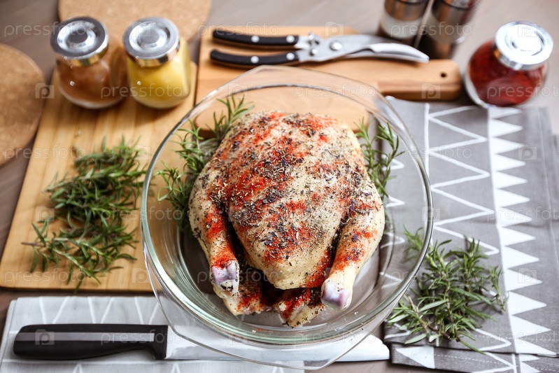 Сырая куриная тушка в специях для жарки. Домашняя кухня. Продукты, специи и кухонные принадлежности