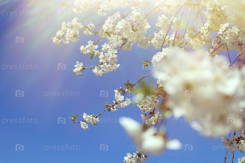 Цветущая ветка вишни на фоне голубого неба. Весеннее время