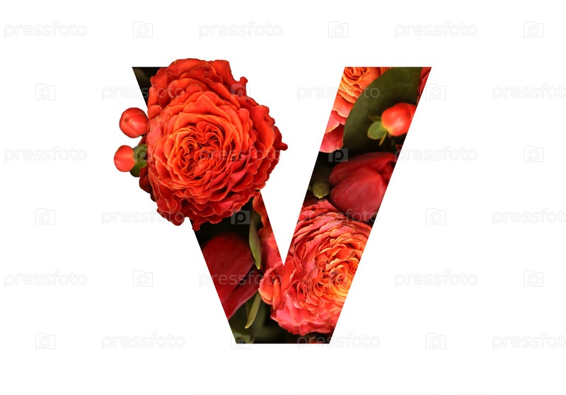 Цветочный шрифт буква V из настоящих красно-оранжевых роз для яркого дизайна. Стильный шрифт из цветов для концептуальных идей