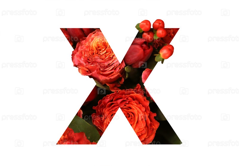 Цветочный шрифт буква X из настоящих красно-оранжевых роз для яркого дизайна. Стильный шрифт из цветов для концептуальных идей