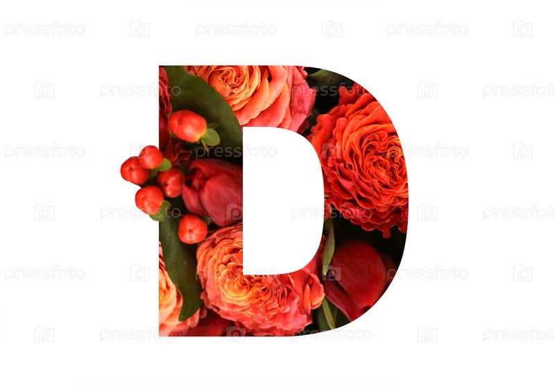 Цветочный шрифт буква D из настоящих красно-оранжевых роз для яркого дизайна. Стильный шрифт из цветов для концептуальных идей