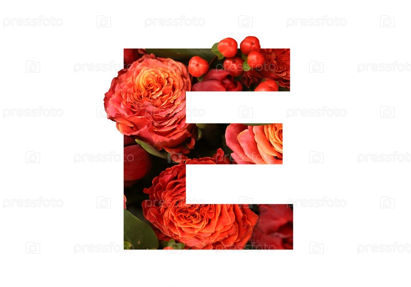 Цветочный шрифт буква E из настоящих красно-оранжевых роз для яркого дизайна. Стильный шрифт из цветов для концептуальных идей