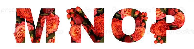 Цветочный шрифт буква MNOP из настоящей красно-оранжевой розы для яркого дизайна. Стильный шрифт из цветов для концептуальных идей