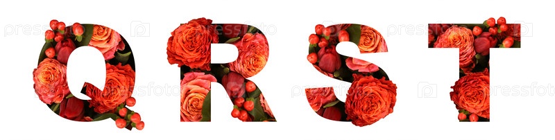 Цветочный шрифт буква QRST из настоящих красно-оранжевых роз для яркого дизайна. Стильный шрифт из цветов для концептуальных идей