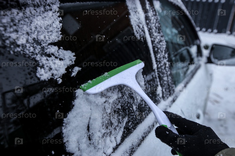 Краснодар, Россия-26 декабря 2018. Очистка автомобиля от снега пластиковым скребком. Экстремальный снегопад в европейском городе