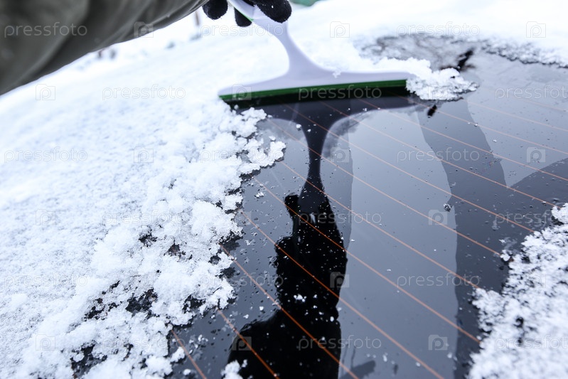 Краснодар, Россия-26 декабря 2018. Очистка автомобиля от снега пластиковым скребком. Экстремальный снегопад в европейском городе