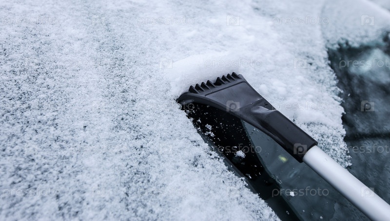 Краснодар, Россия-26 декабря 2018. Очистка автомобиля от снега пластиковым скребком. Экстремальный снегопад в европейском городе