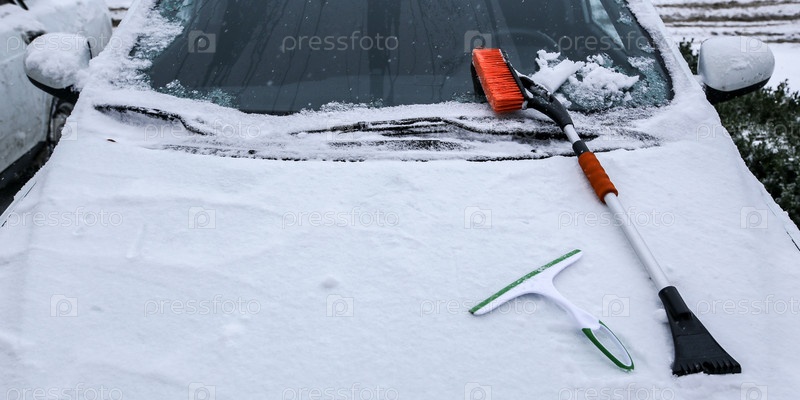 Краснодар, Россия-26 декабря 2018. Очистка автомобиля от снега пластиковым скребком. Экстремальный снегопад в европейском городе