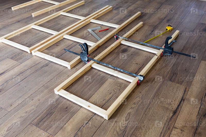 Процесс изготовления деревянной стойки, детали скреплены струбцинами