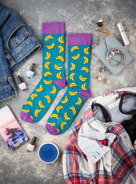 Flat lay fashion photography. Стильный женский наряд. Обувь, джинсы, рубашка и футболка, носки и модные аксессуары с косметикой. Модная удобная одежда
