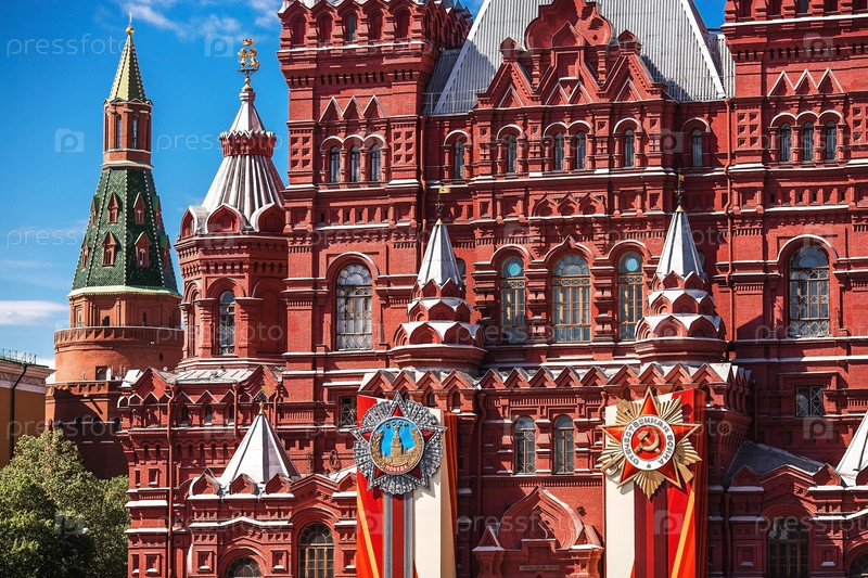 Россия, Москва, 28 апреля 2025 г. Подготовка к празднованию 80-летия Дня Победы. Украшения на здании Исторического музея на Красной площади