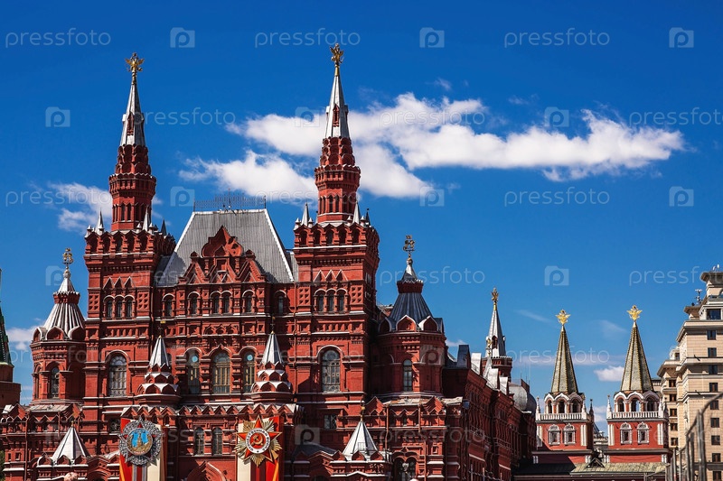Россия, Москва, 28 апреля 2025 г. Подготовка к празднованию 80-летия Дня Победы. Украшения на здании Исторического музея на Красной площади