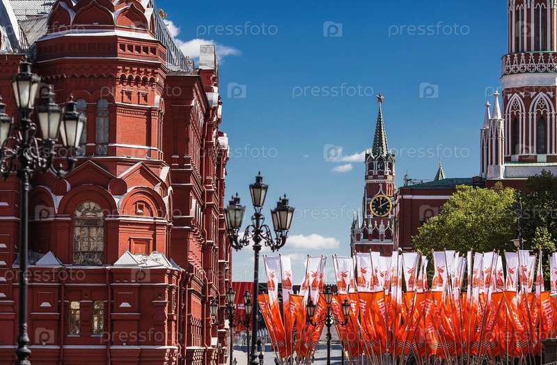 Россия, Москва, 28 апреля 2025 г. Подготовка к празднованию 80-летия Победы в Великой Отечественной войне. Праздничные флаги на фоне Кремля