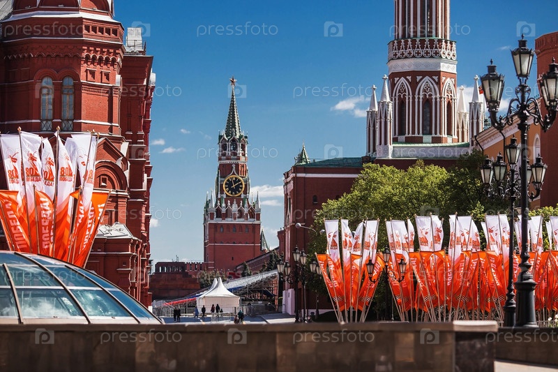 Россия, Москва, 28 апреля 2025 г. Подготовка к празднованию 80-летия Победы в Великой Отечественной войне. Праздничные флаги на фоне Кремля