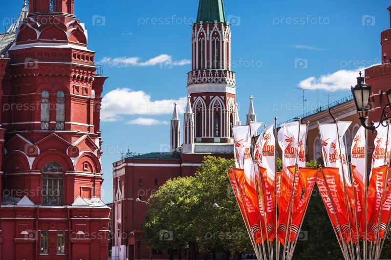 Россия, Москва, 28 апреля 2025 г. Подготовка к празднованию 80-летия Победы в Великой Отечественной войне. Праздничные флаги на фоне Кремля