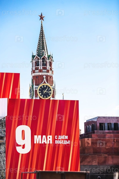 Россия, Москва, 28 апреля 2025 г. Подготовка к празднованию 80-летия Победы в Великой Отечественной войне. Праздничное оформление Красной площади