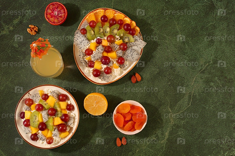 Фон кухни с фруктовыми салатами с мягким творогом, йогуртом, драконьим фруктом, киви, манго, апельсинами, орехами, апельсиновым соком и виноградом. Здоровый легкий завтрак с ингредиентами,