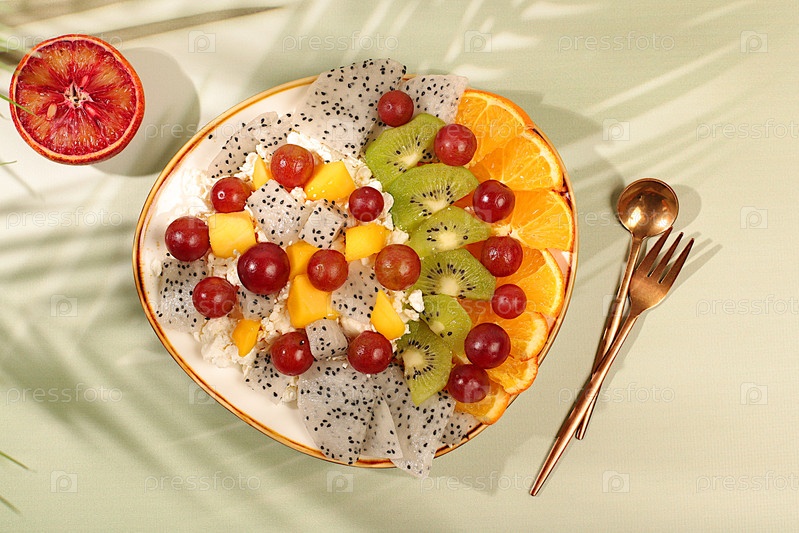 Фруктовый салат с мягким творогом, йогуртом, драконьим фруктом, киви, манго, апельсинами, орехами и виноградом. Здоровый легкий завтрак с ингредиентами, диета, здоровый образ жизни, реклама, кухонный фон, баннер