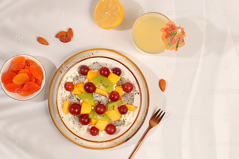 Фруктовый салат с мягким творогом, йогуртом, драконьим фруктом, киви, манго, апельсинами, орехами, виноградом и соком, Здоровый легкий завтрак с ингредиентами. Реклама диетического здорового образа жизни,