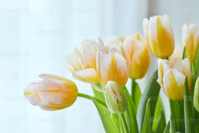 Букет белых и желтых тюльпанов в вазе на окне. Нежные цветы к празднику
