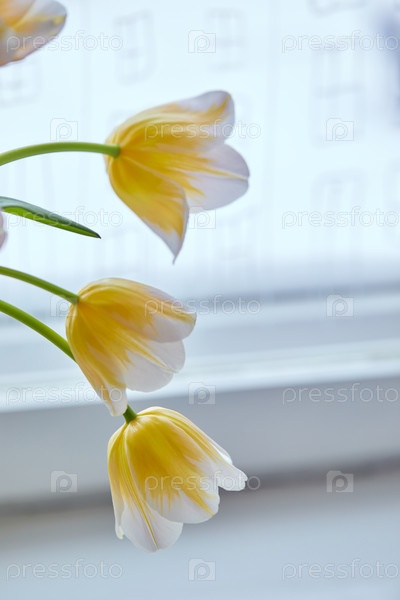 Букет белых и желтых тюльпанов в вазе на окне. Нежные цветы к празднику