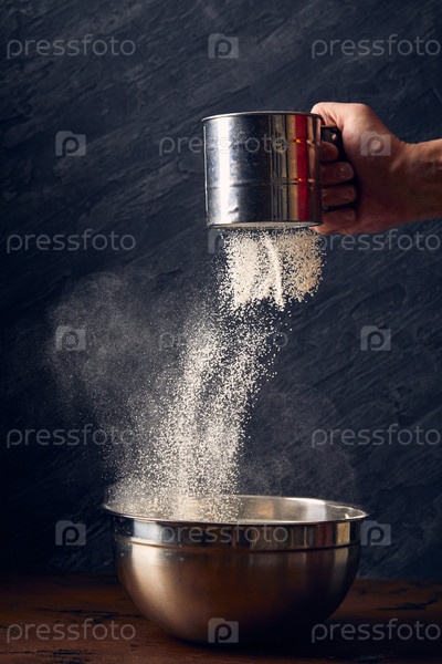 Рука мужчины просеивает пшеничную муку через сито кружка за столом на черном фоне, крупный план