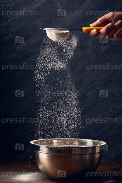 Рука мужчины просеивает пшеничную муку через сито за столом на черном фоне, крупный план