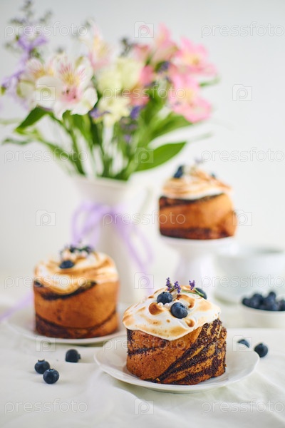 Традиционные пасхальные куличи на праздничном столе украшены живыми цветами и красочными расписными пасхальными яйцами