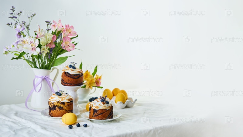 Традиционные пасхальные куличи на праздничном столе, украшенные живыми цветами и красочными расписными пасхальными яйцами. Кулич - это вид пасхального хлеба, который является традиционным в православной христианской вере