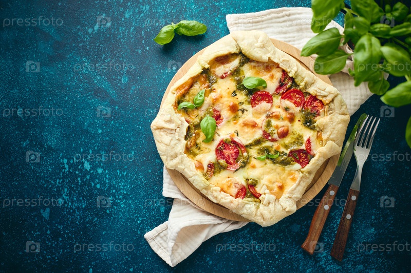 Пирог типа галет из слоеного теста с начинкой из помидоров, сыра моцарелла и соуса песто. Галет Капрезе