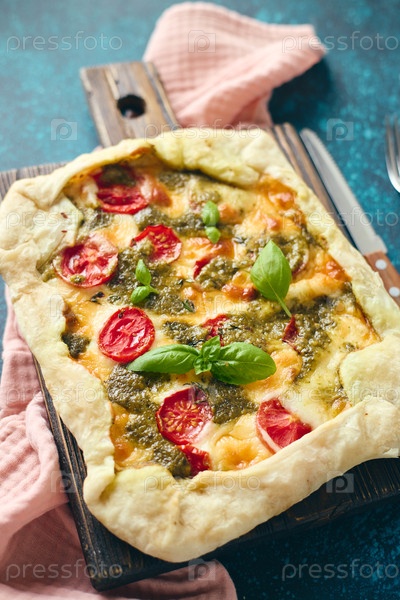 Пирог типа галет из слоеного теста с начинкой из помидоров, сыра моцарелла и соуса песто. Галет Капрезе