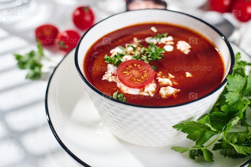 Холодный испанский томатный суп гаспачо, украшенный петрушкой, сыром фета и специями с поджаренными ломтиками хлеба, помидорами и зеленью на белом столе. Крупным планом