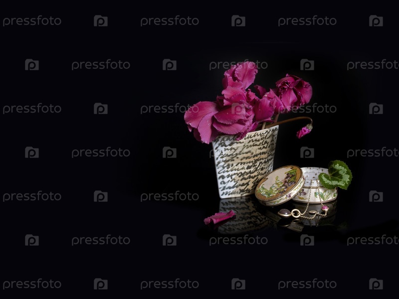 Букет цикламенов в вазе на черном фоне