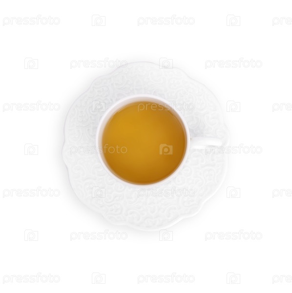 Фарфоровая чашка с чаем на белом фоне. Элемент дизайна с обтравочным контуром