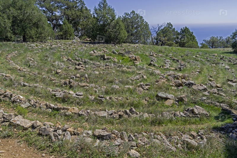 Семиуровневый лабиринт, созданный последователями современных эзотерических учений. Гора Перчем, Судак, Крым. Солнечный день в апреле