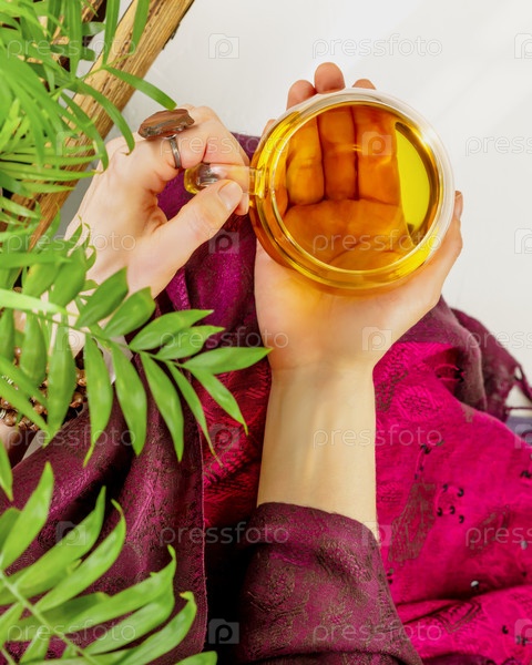 Женщина с целебным травяным чаем отдыхает в окружении лиственных растений