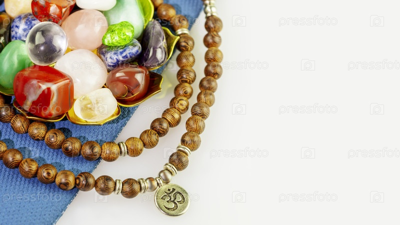 Кристаллы драгоценных камней, установленные с четками на коврике для йоги на белом фоне
