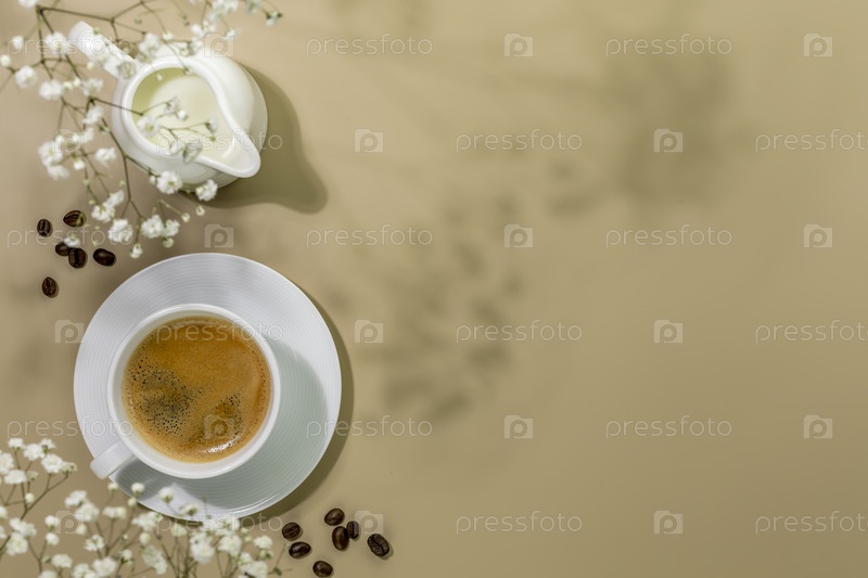 Чашка кофе, сливки с молоком и кофейные зерна на бежевом фоне